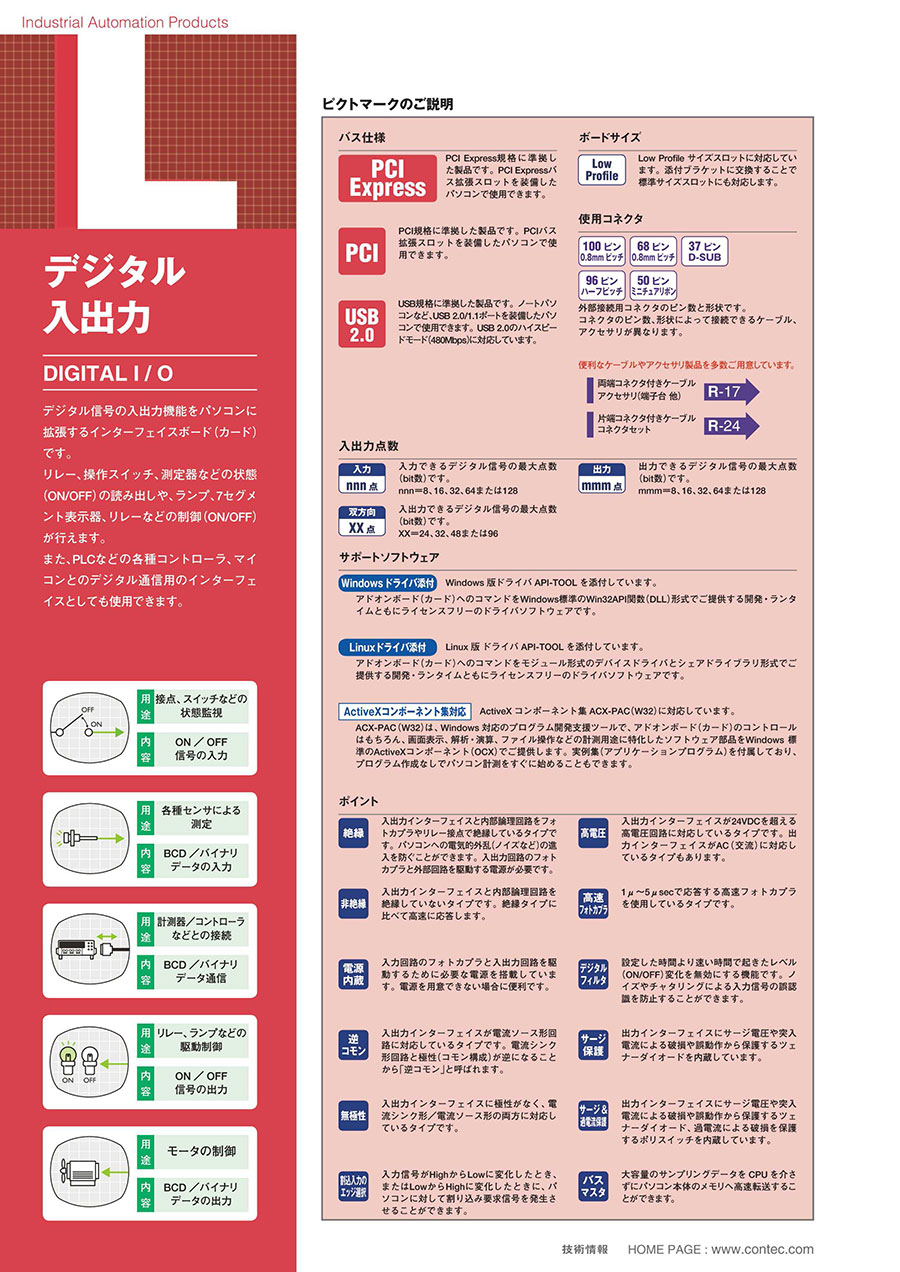 【特長】・デジタル信号の入出力機能をパソコンに拡張するインターフェイスボード(カード)です。・リレー、...
