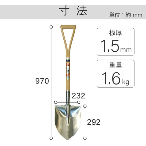 ・頭部(すくい部)はSUS304(18-8)ステンレスを使用し、サビにくく、土の付着が少なく、手入れが容易で耐食性に優れています。