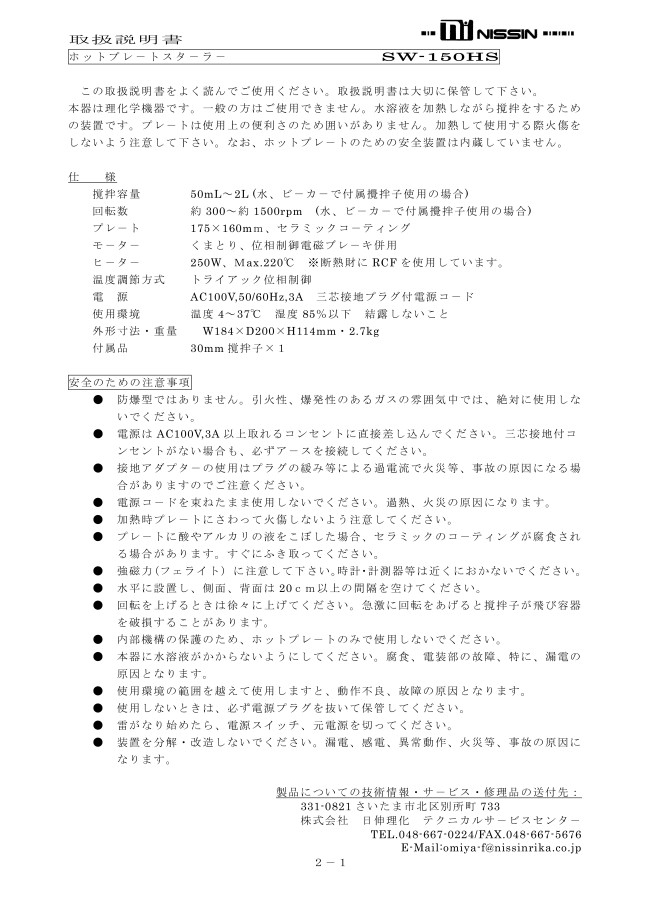 ・撹拌容量:50~3000ml(水、ビーカーで付属回転個使用)